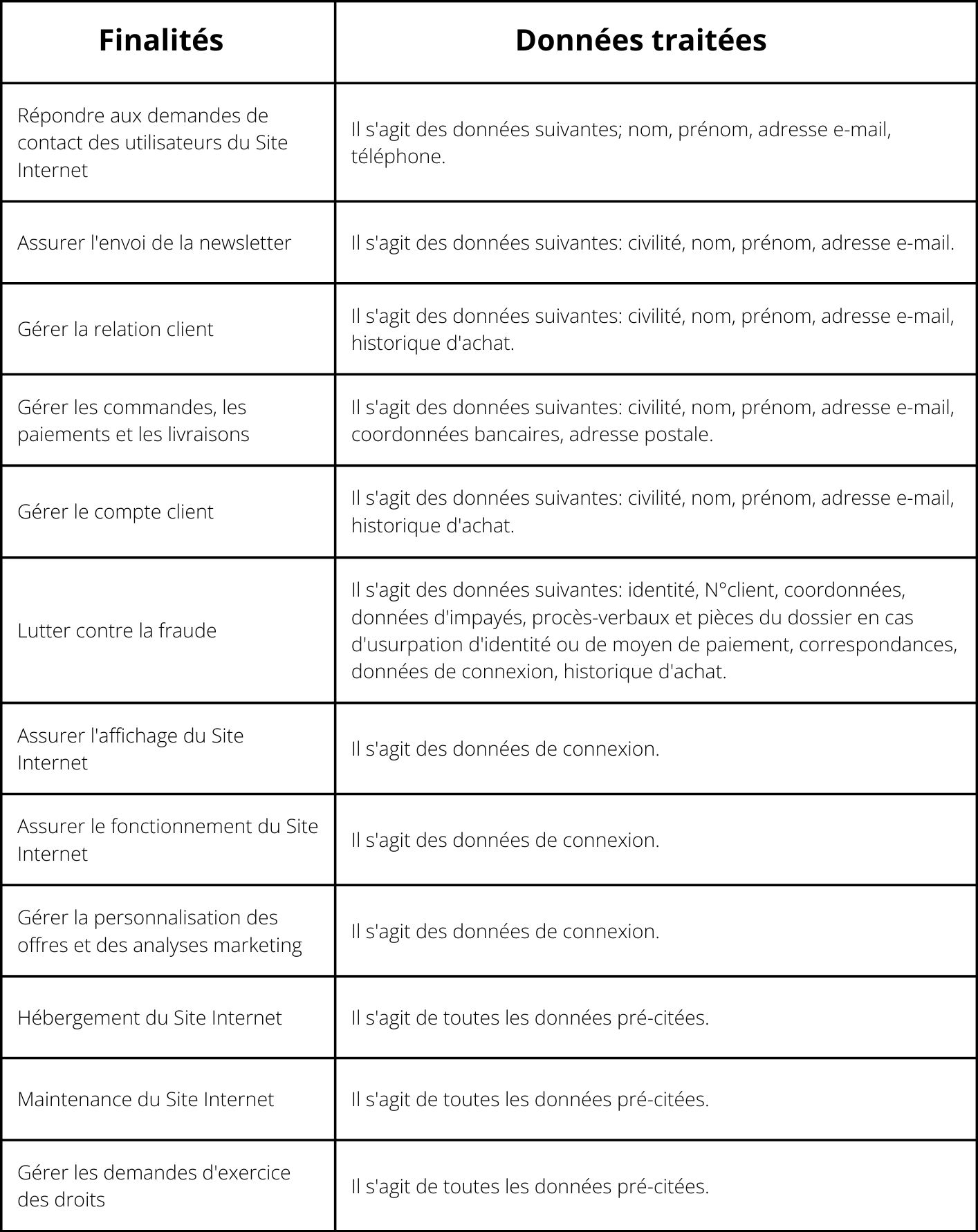 Le Responsable du Traitement est amené à traiter les données personnelles des utilisateurs du Site Internet. Les catégories de données traitées dépendent de la finalité du traitement.