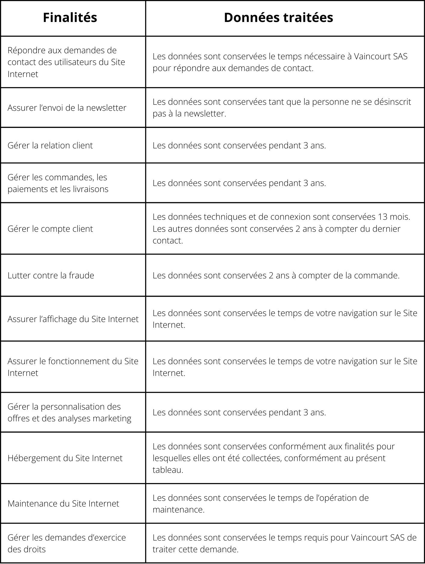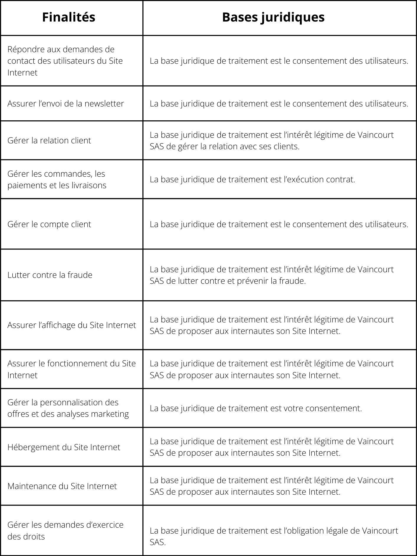 La société Vaincourt SAS, société par actions simplifiée immatriculée au RCS de Paris sous le numéro 403 156 300 et dont le siège social est situé 17 rue Duphot - 75001 Paris, est le responsable des traitements (« Vaincourt » ou le « Responsable du Traitement ») effectués sur le site Internet https://www.vaincourt.com/ (le « Site Internet »). Vous pouvez contacter son responsable Sophie Gachet par courrier électronique à l’adresse suivante : contact@vaincourt.com ou par téléphone au numéro suivant : +33 7 82 07 78 43.